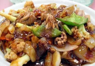 做法:猪腰切片上十字花刀,过水捞过再过油,锅中下酱油、香醋、糖、盐、胡椒和湿淀粉的调味汁,倒入处理好的猪腰子、海蜇头和花菜,旺火快速翻炒过,出锅倒入炸过的馒头片垫底的盘子中。