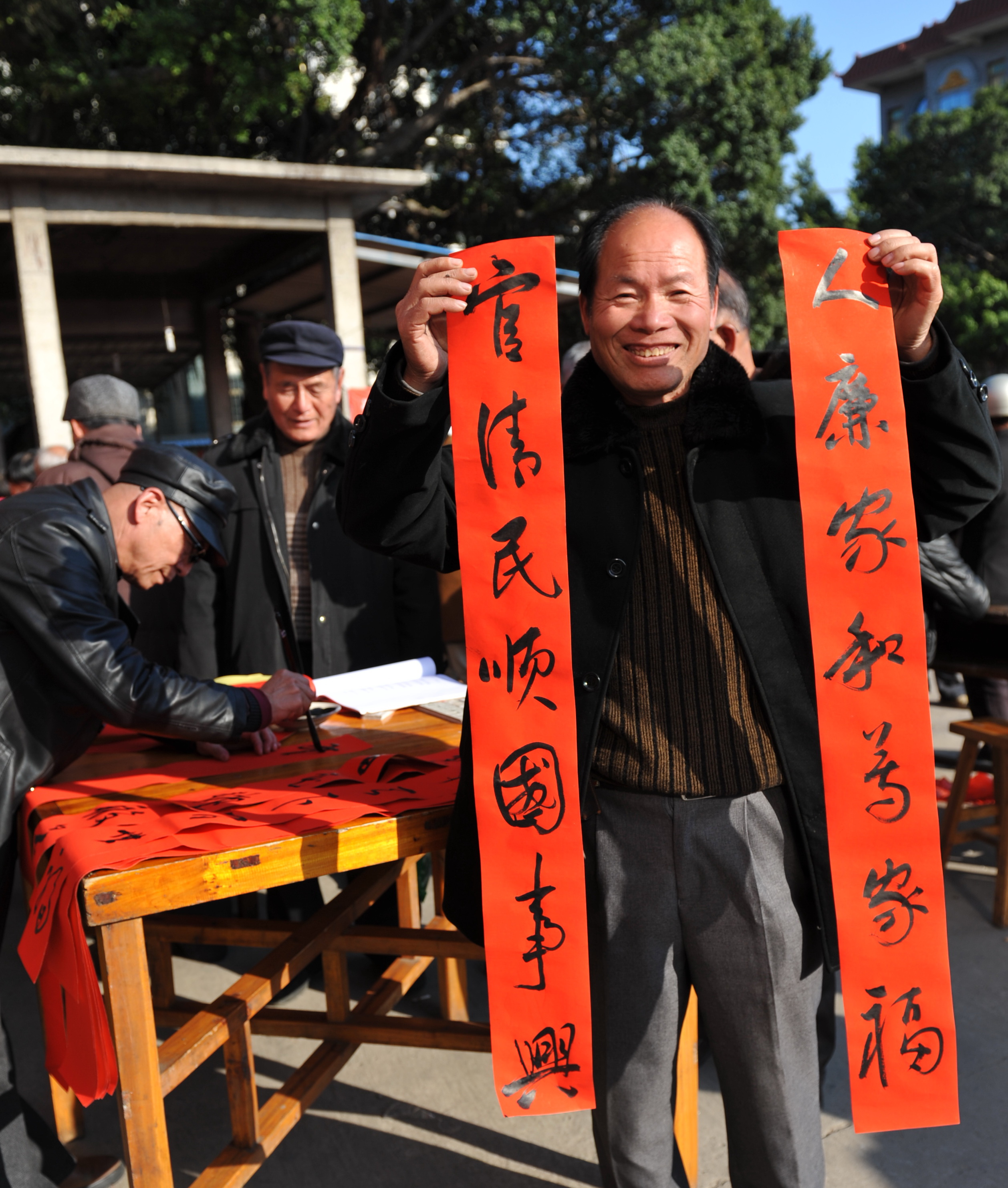 1月16日,长乐市文武砂镇洽屿村村民林书官在展示收到的廉政春联。
