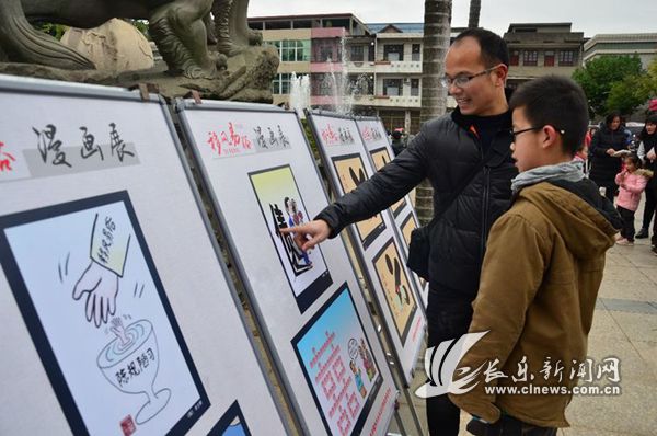 2月1日,长乐区潭头镇大宏村村民带着孩子在观看移风易俗漫画展。